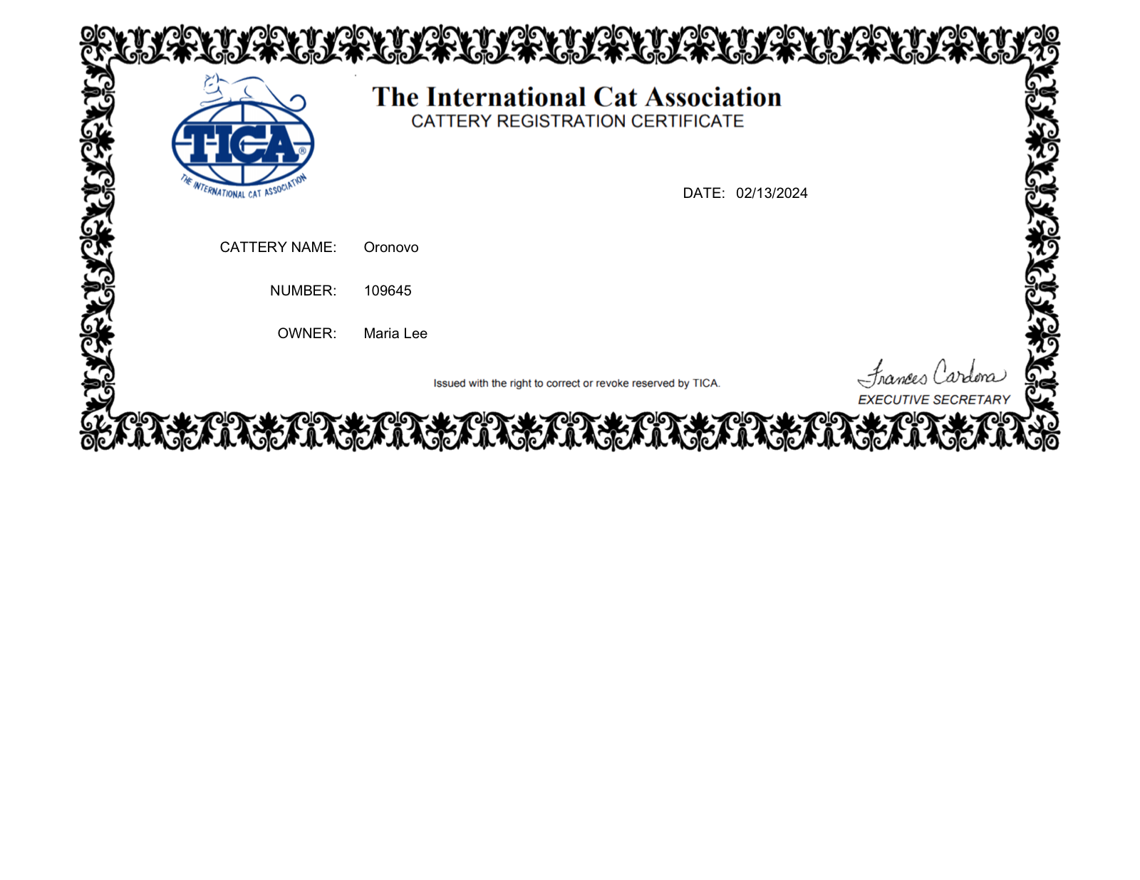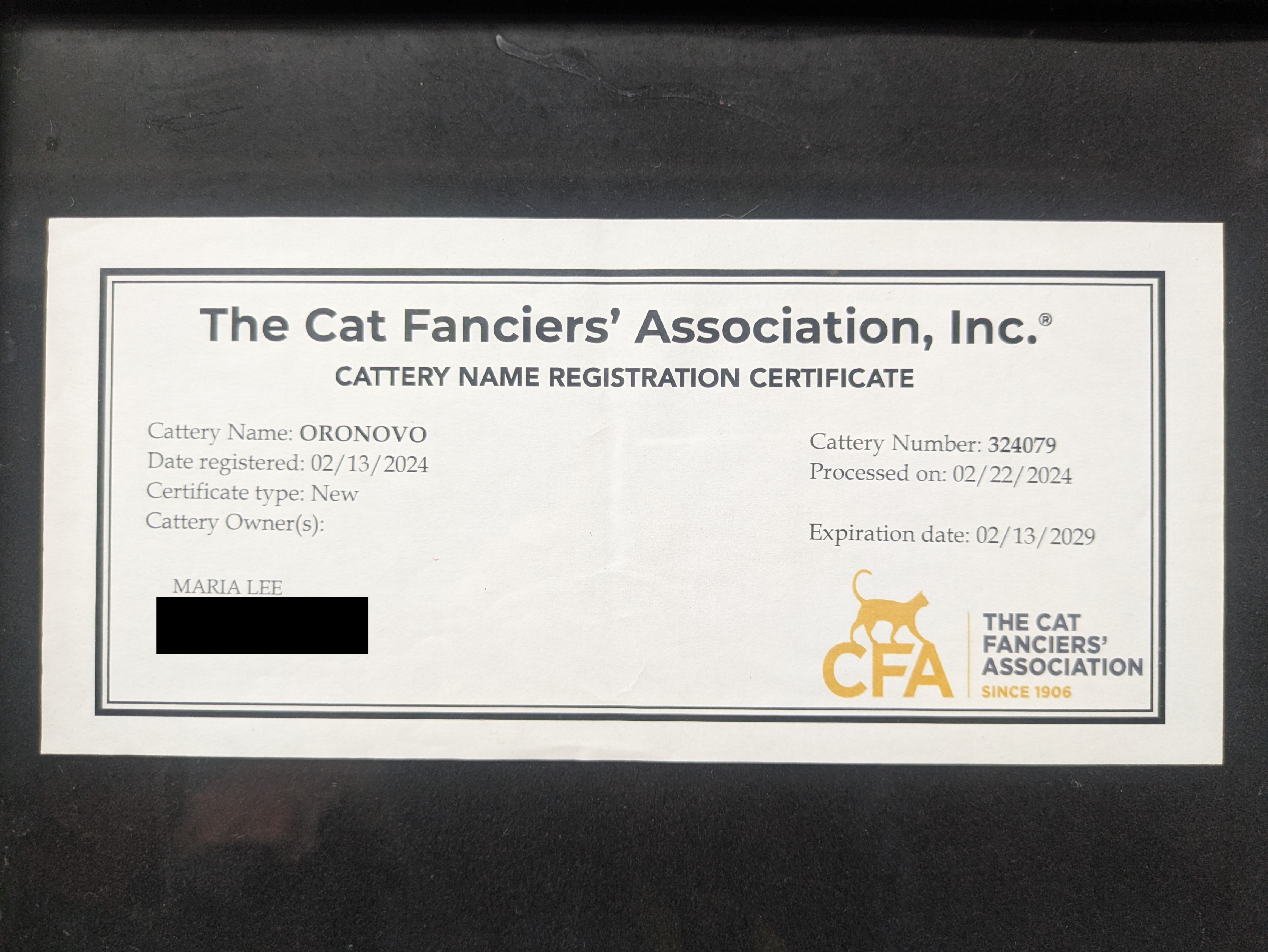 All Oronovo kittens are registered with TICA (The International Cat Association). Oronovo is a registered cattery with both TICA and CFA (Cat Fanciers' Association). Our breeding cats carry verified Italian pedigrees through ANFI/FIFe and AGI/WCF.